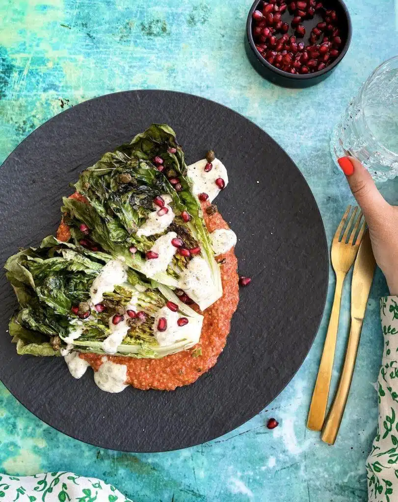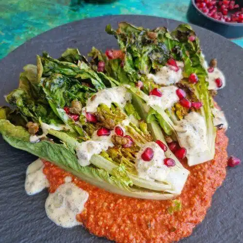 Herlig grillet hjertesalat med muhammaradipp og caesardressing.