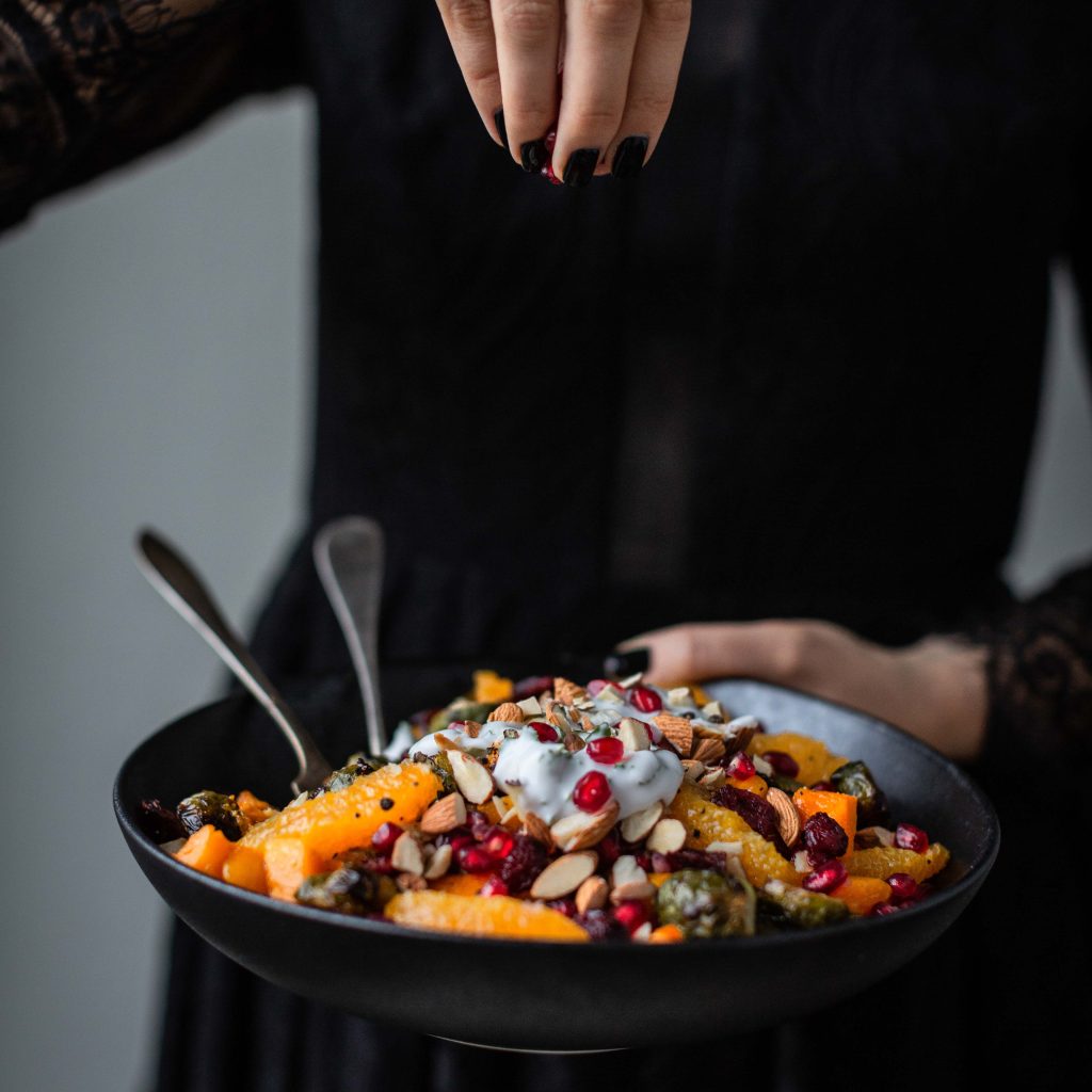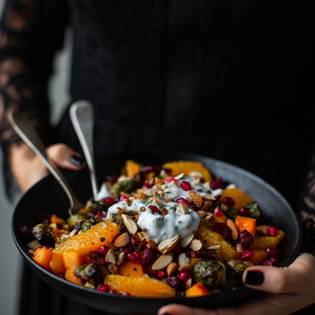 • For montering liker jeg å starte med linser i bunn, deretter ta rosenkål og gresskar, deretter tranebær, mandler, appelsiner, litt dressing og granateple på toppen.